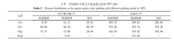 礦物表面性質與其浮選行為密切相關,采用 X 射線光電子能譜考察硅酸鹽礦物在不同磨礦介質濕磨后表面元素變化的情況,確定礦物表面物質的存在形式.不同磨礦介質下,硅酸鹽礦物表面元素的 X 射線光電子能譜分析結果見表 1 ~ 表 5.表 1 ~ 表 5 的研究結果表明: 與原礦相比,( 1) 氧化鋯珠濕磨后,鋯英石表面 Zr 的原子數(shù)分數(shù)由 8. 30% 增加