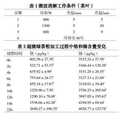 血[6];過量的鎳可引起炎癥、癌癥、癥、系統(tǒng)紊亂、降低生育能力、致畸和致突變等[7];鉻雖是人體必需的微量元素,但高鉻的食用也會引起不適[8]。超微綠茶粉是將達(dá)到綠色標(biāo)準(zhǔn)的綠茶茶葉,經(jīng)超微粉碎形成 200 目(74μm)甚至達(dá)到 1000 目(12μm)以上的綠茶超微細(xì)粉[9-10]?,F(xiàn)階段我國企業(yè)大多采用球磨方式加工超微綠茶粉,在球磨加工過程中,茶葉被粉碎的同時(shí),研磨材料本身也會發(fā)生變化,從而可能給超微綠茶粉帶來重金屬污染。另外,與傳統(tǒng)茶葉不同的是,超微綠茶粉屬于茶葉深加工范疇,常被以全組分形式加入到食品和化妝品中[11],又因其中的重金屬元素應(yīng)滿足《食品標(biāo)準(zhǔn)食品中污染物限量》和《茶葉中鉻、鎘、汞、砷及氟化物限量》對茶葉中重金屬限量要求[12-13],因此應(yīng)對超微綠茶粉加工過程中重金屬污染給予關(guān)注,但目前對超微綠茶粉加工過程中的重金屬含量變化未見報(bào)道。本文對球磨加工過程中超微綠茶粉的重金屬含量進(jìn)行檢測分析,同時(shí),采用三組球磨材料不銹鋼球-不銹鋼罐、氧化鋯球-不銹鋼罐、瑪瑙球-尼龍罐對超微綠茶粉進(jìn)行加工,通過重金屬元素鉻和鎳的檢測,并結(jié)合粒徑分析,為尋找合適的球磨材料提供依據(jù)。